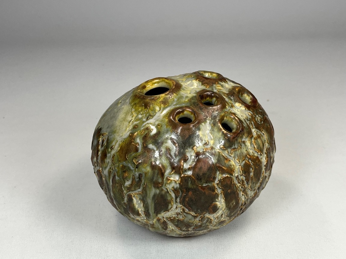 Stoneware flower frog by Jørgen Mogensen. Painted: jm, F261, Danmark Height: 12 cm (4.7") Width: 14 cm (5.5") Weight: 0.9 kg (2 lbs)