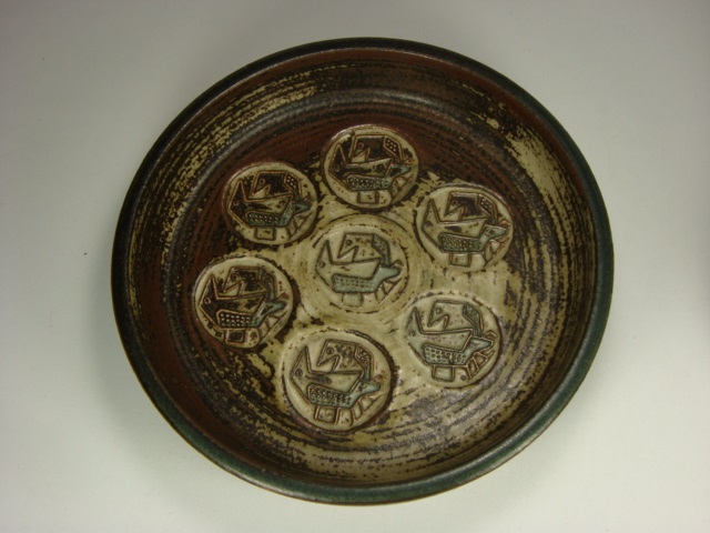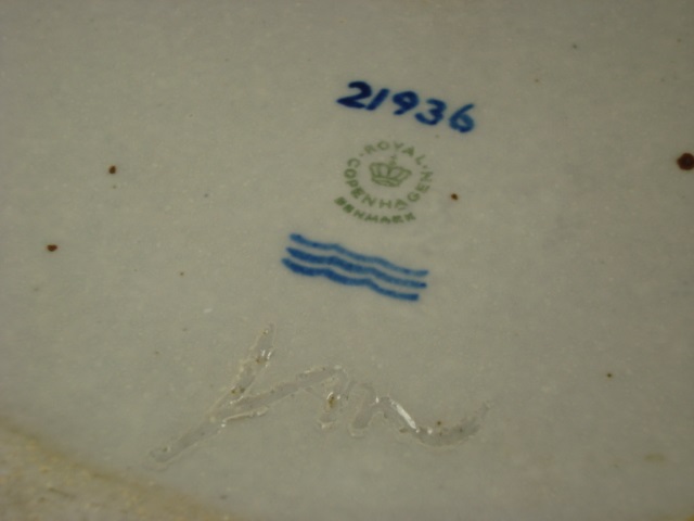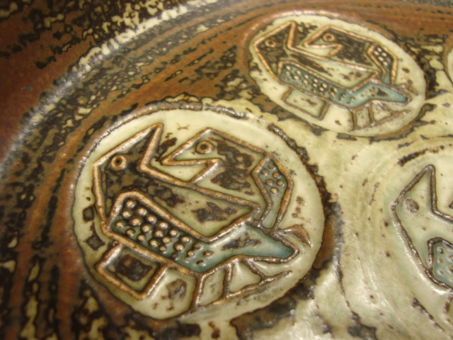 Stoneware bowl with relief decoration. Designed 1962. Painted: Three waves 21936. Incised: jm Height: 5,5 cm (2.2"") Width: 27 cm (10.6"") Weight: 2.4 kg (5.3 lbs)