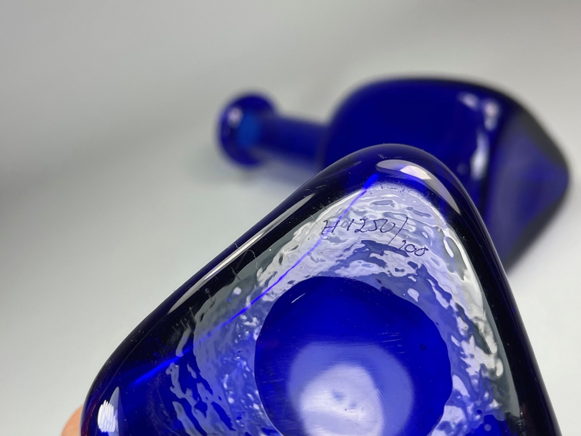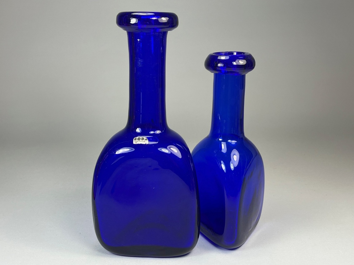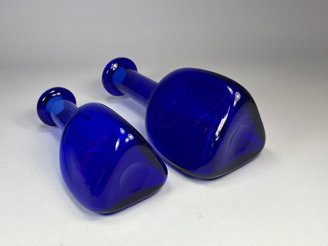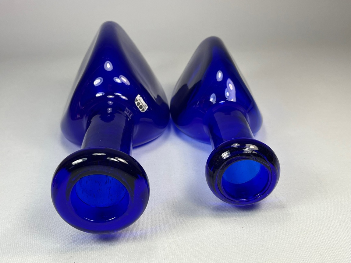 Two bottle shaped vases with triangular body. Engraved: H1250/200 and 1250/250 Height: 21.5 cm and 25.5 cm (8.5" and 10") Weight: 1,7 kg (3.7 lbs)
