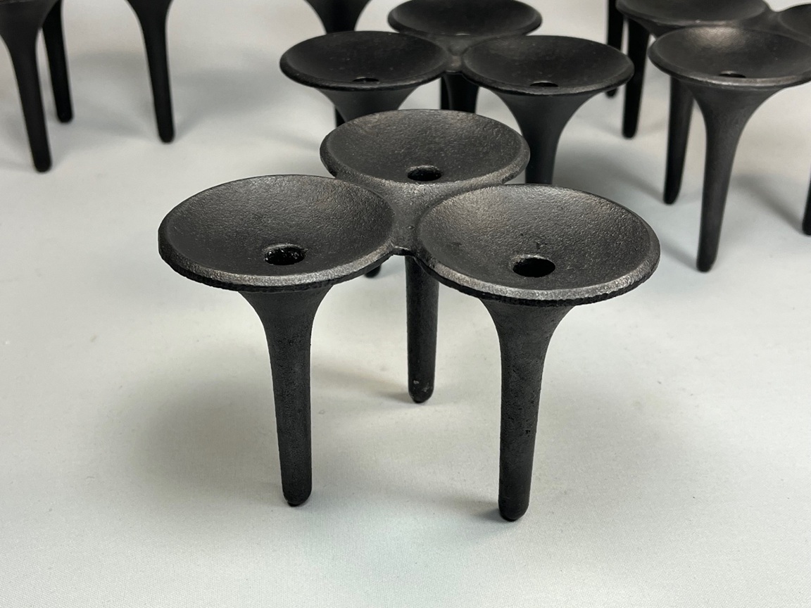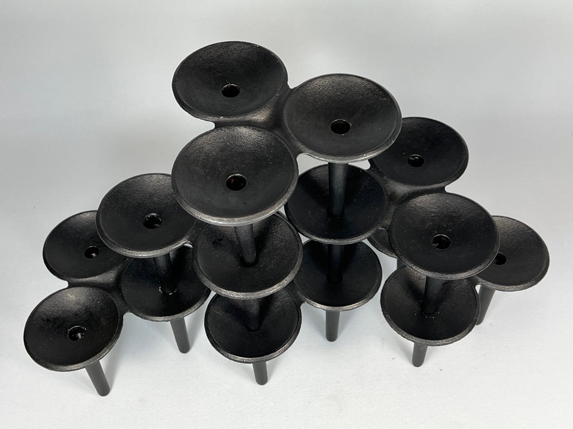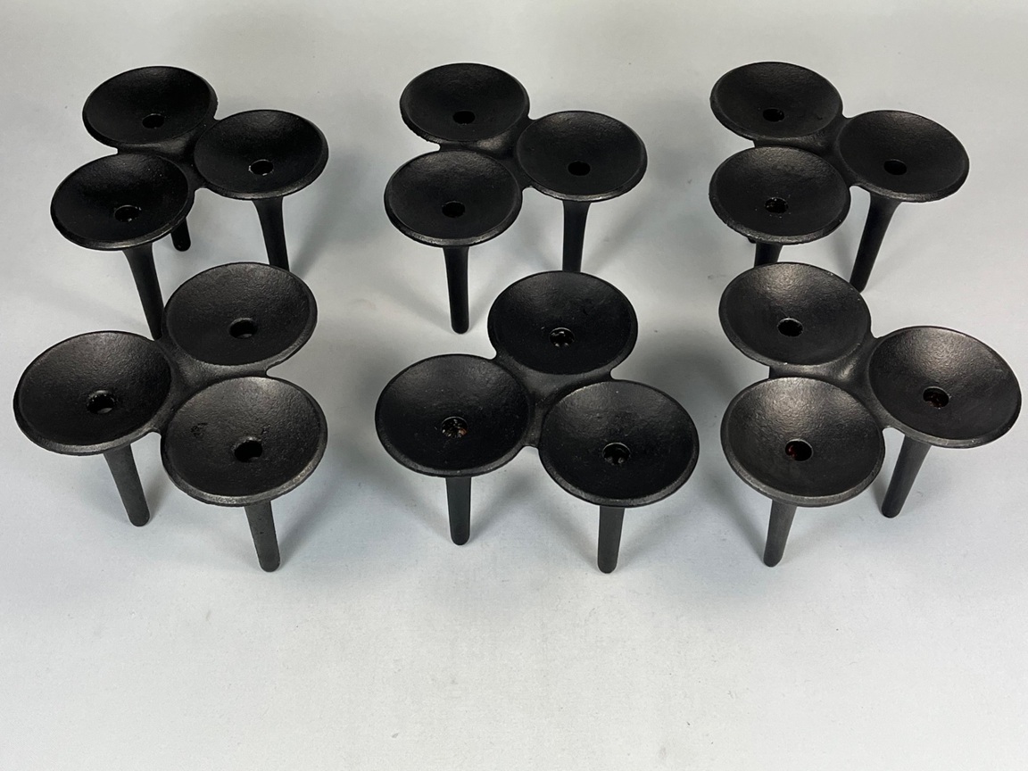 Six stackable cast iron candlestick, model name "Hornblower",  designed by Christer & Christel Holmgren. Sold by Illums Bolighus in Copenhagen, in the early 1960s.